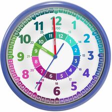 Timekeeper Colorful Wall Clock transforms your classroom by combining educational features with silent operations and vibrant colors. High-quality, visually appealing glass dial provides a clear view of the time, ensuring easy readability. Silent sweet mechanism eliminates disruptive ticking sounds. 60-seconds/minutes display comes with labeled "HOUR" and "MINUTE" hands to help kids understand and tell time and includes both 12 and 24-hour time increments. Use requires one AA battery (not included).